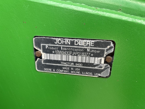 Sellers Comments: 2010 JOHN DEERE 9430, 425 ENGINE HORSEPOWER, 18F/6R POWERSHIFT TRANSMISSION, DIFFERENTIAL LOCK, 710/70R42 TIRES & WHEELS, TIRES (DUALS), REAR AXLE WEIGHTS: (2)165 LB & (6)450 LB & (4)1500 LB, 4 SCVS (ELECTRONIC), 48 GPM HYDRAULIC PUMP, NO PTO, NO THREE-PO