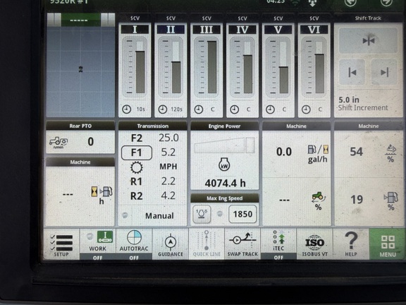 Sellers Comments: 2017 JOHN DEERE 9520R, 520 ENGINE HORSEPOWER, 18F/6R POWERSHIFT TRANSMISSION, DIFFERENTIAL LOCK, LSW 1400/30R46 TIRES & WHEELS, TIRES (SINGLES), 2800 LB FRONT AXLE WEIGHT (2 × 1400 INSIDE TIRES), 4100 LB REAR AXLE WEIGHT (2 × 1400 INSIDE TIRES AND 13 SUIT