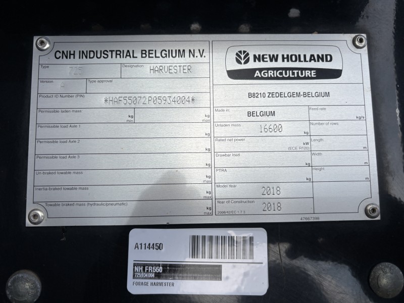 These specifications represent the most common configurations for the Model DescriptionNew Holland FR550 in 2018. They may not describe New Holland's original specifications nor do they describe the specific FR550 Forage Harvester listed for sale here.