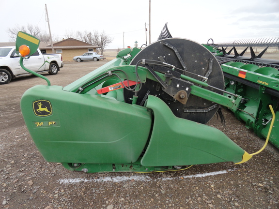 Sellers Comments: 2019 JOHN DEERE 745FD, 45 FT CUTTING WIDTH, FLEX DRAPER, STEEL AUGER FINGERS, TOP CROP AUGER, LOW STONE DAM, FORE/AFT REEL, HEADER HEIGHT SENSING IN RIGID MODE, FLIP OVER REEL, SINGLE-POINT CONNECTION, NO WIND SYSTEM, TELESCOPING PTO DRIVE, POLY SKIDSHOES