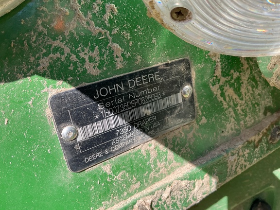 Sellers Comments: 2023 JOHN DEERE 735D, 35 FOOT CUTTING WIDTH, RIGID DRAPER PLATFORM, FULL FINGER AUGER, STEEL AUGER FINGERS, NO TOP CROP AUGER, FORE/AFT REEL, HEADER HEIGHT SENSING IN RIGID MODE, NON-FLIP OVER REEL, SINGLE-POINT CONNECTION, NO WIND SYSTEM, TELESCOPING PTO