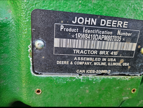 Sellers Comments: 2023 JOHN DEERE 8RX 410, FEATURES: 410 ENG HP, 310 PTO HP, EVT (40K), 30" TRACKS ON REAR 24" TRACKS ON FRONT, 90% TREAD REMAINING, , 120" TRACK SPACING, 6 SCVS, 85 GPM, 1 3/8" 1000 PTO, DELUXE AIR RIDE SEAT - LEATHER, LIGHTS FRONT & REAR, WARRANTY: POWERG