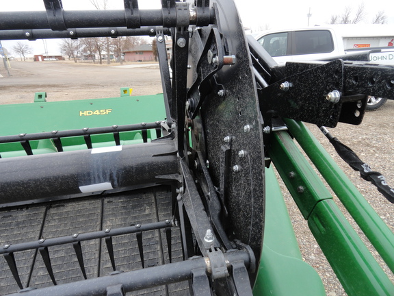 Sellers Comments: 2023 JOHN DEERE HD45F, 45' CUTTING WIDTH, HINGED FLEX DRAPER, STEEL AUGER FINGERS, TOP CROP AUGER, LOW STONE DAM, FORE/AFT REEL, FLIP OVER REEL, SINGLE-POINT CONNECTION, CRARY WIND SYSTEM, TELESCOPING PTO DRIVE, NO SPARE SICKLE, NO TRANSPORT, HIGH WEAR SK