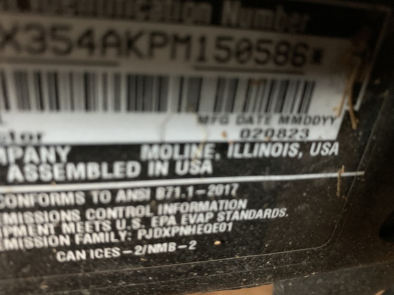 Sellers Comments: 2023 JOHN DEERE X354, KAWASAKI ENGINE, 21 ENGINE HORSEPOWER, AIR-COOLED ENGINE, GAS CARBURETED, 18 INCH CUT-AND-SEWN HIGH BACK SEAT, STANDARD SEAT, FOUR-WHEEL STEERING, MANUAL STEERING, 42 INCH DECK, SIDE DISCHARGE, MANUAL LIFT HAND LEVER, LIGHTS, HOUR ME