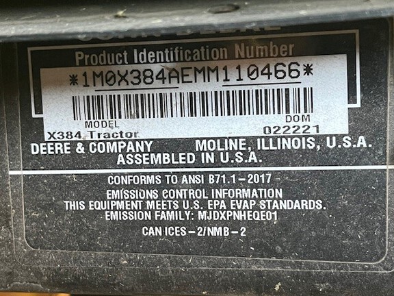 Sellers Comments: 2021 JOHN DEERE X384, 23 HP KAWASAKI ENGINE, AIR COOLED ENGINE, GAS CARBURETED, 18 INCH CUT AND SEWN HIGH BACK SEAT, FOUR WHEEL STEERING, MANUAL STEERING, 48 INCH DECK, DEEP ACCEL DECK, SIDE DISCHARGE, ANTI SCALP WHEELS, MANUAL FOOT LIFT, DIGITAL FUEL GAU